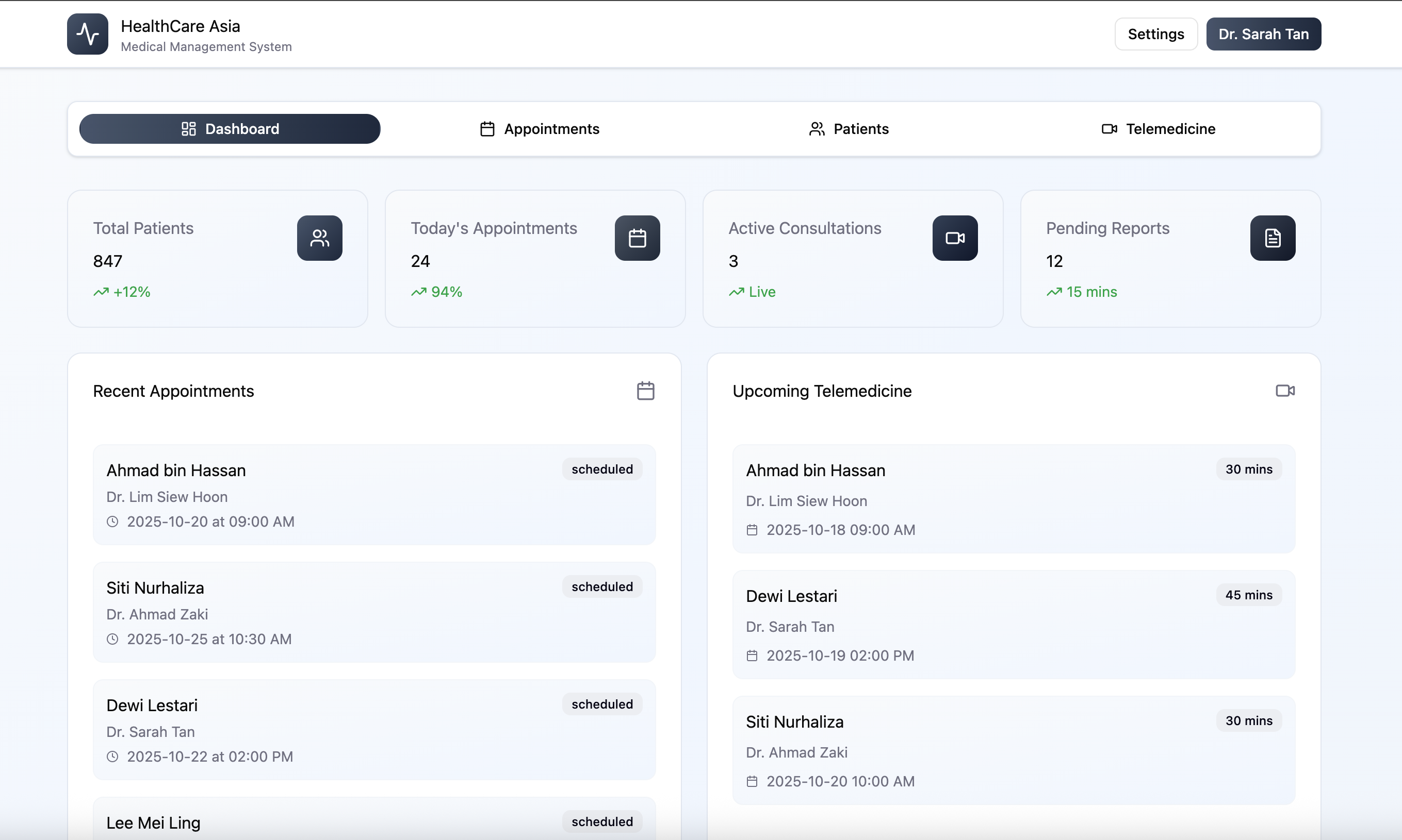 Comprehensive patient management system with appointment scheduling, medical records, and telemedicine features.